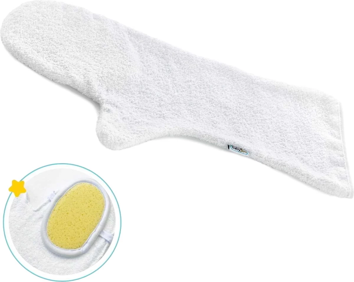 Bij de douche handschoen wordt tevens een sponsje meegeleverd. Deze is met een handig bandje over de handschoen op je vingers te plaatsen om je kindje te kunnen wassen.