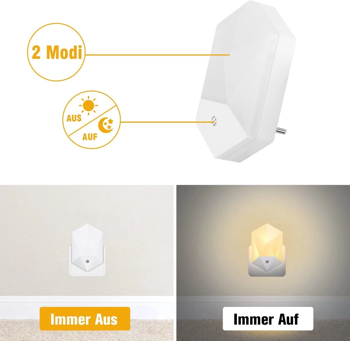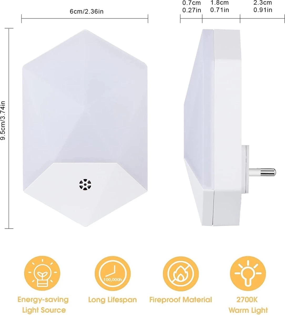 Automatische aan/uit schemersensor: de nachtlamp is uitgerust met een intelligente geïntegreerde schemersensor. Hij wordt automatisch ingeschakeld bij schemering en nacht (bij onvoldoende omgevingslicht) en uitgeschakeld bij dageraad. Gewoon in het stopcontact steken en gebruiken.