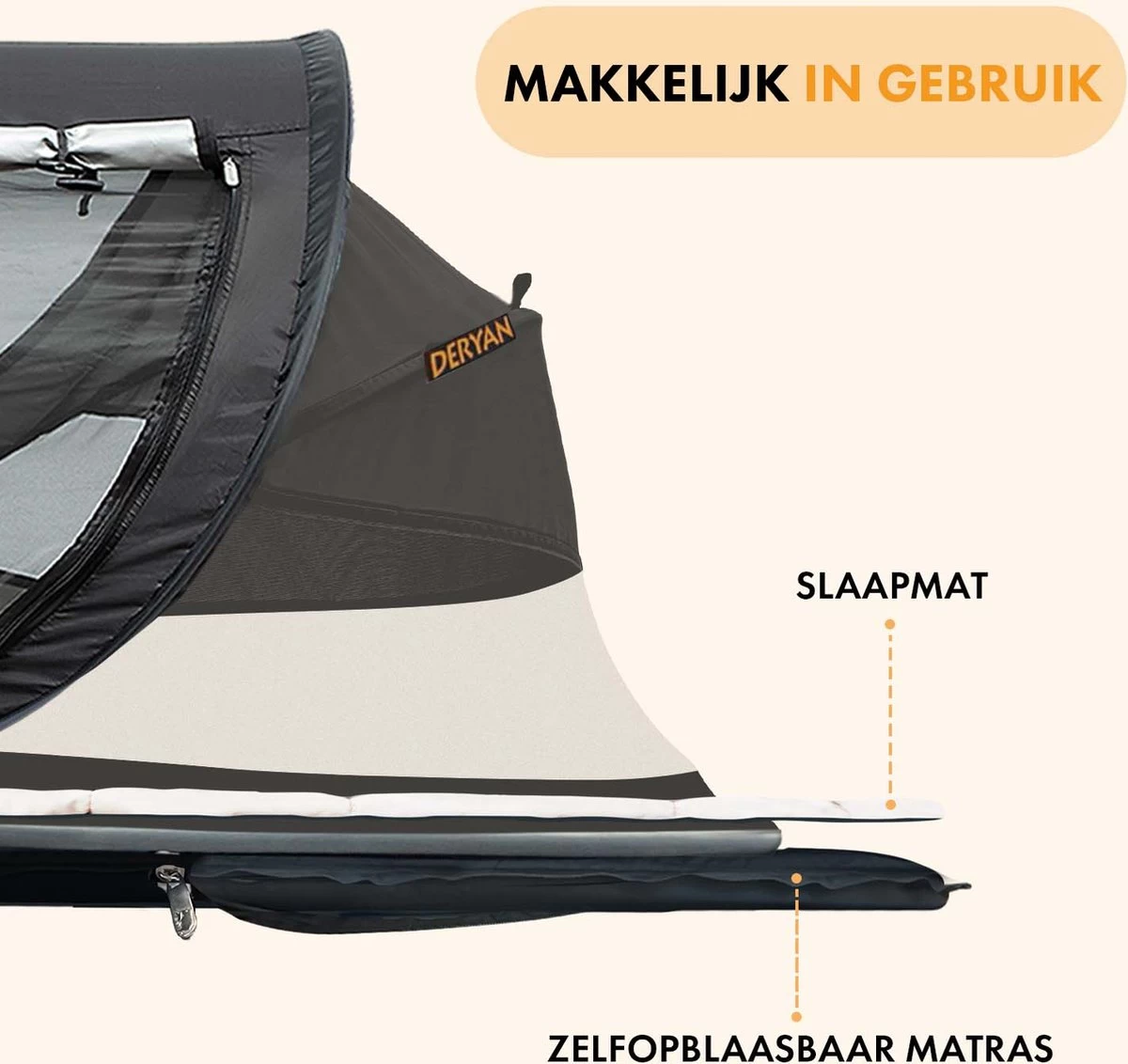 De DERYAN Peuter Luxe is dé ideale oplossing én vervanging van het zware campingbedje. Laat je niets meer in de weg staan met deze compacte, lichtgewicht & pop-up reistent. De DERYAN Peuter Luxe biedt een ultieme bescherming tegen zon, muggen en andere insecten. Met zijn 2,4 kg neem je ‘m in een handomdraai mee naar ouders, familie, vrienden, vakantie of de wereldreis van je dromen! Ondenkbaar veel mogelijkheden!