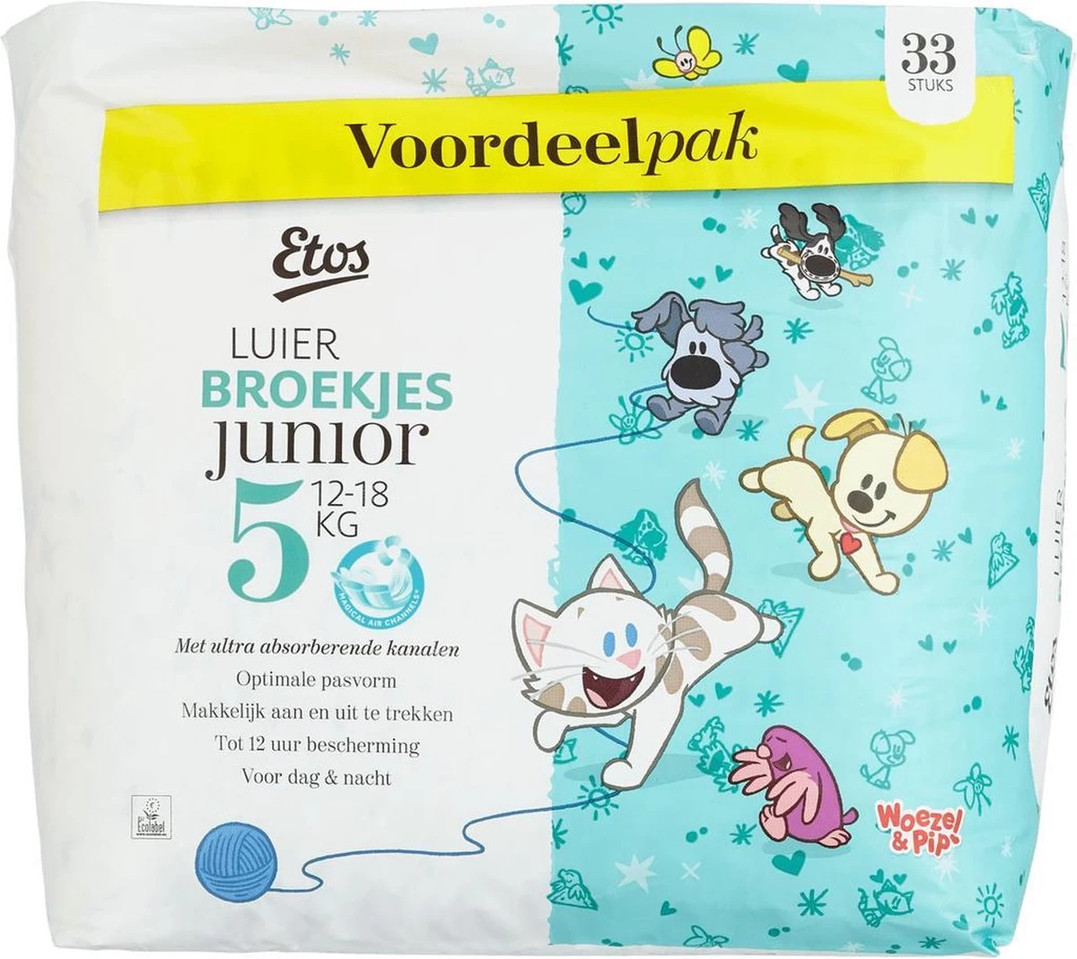 Etos Woezel & Pip Luierbroekjes Junior 5 zijn geschikt voor kindjes van 12 tot 18 kg.