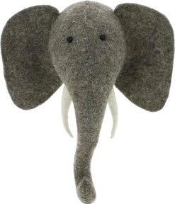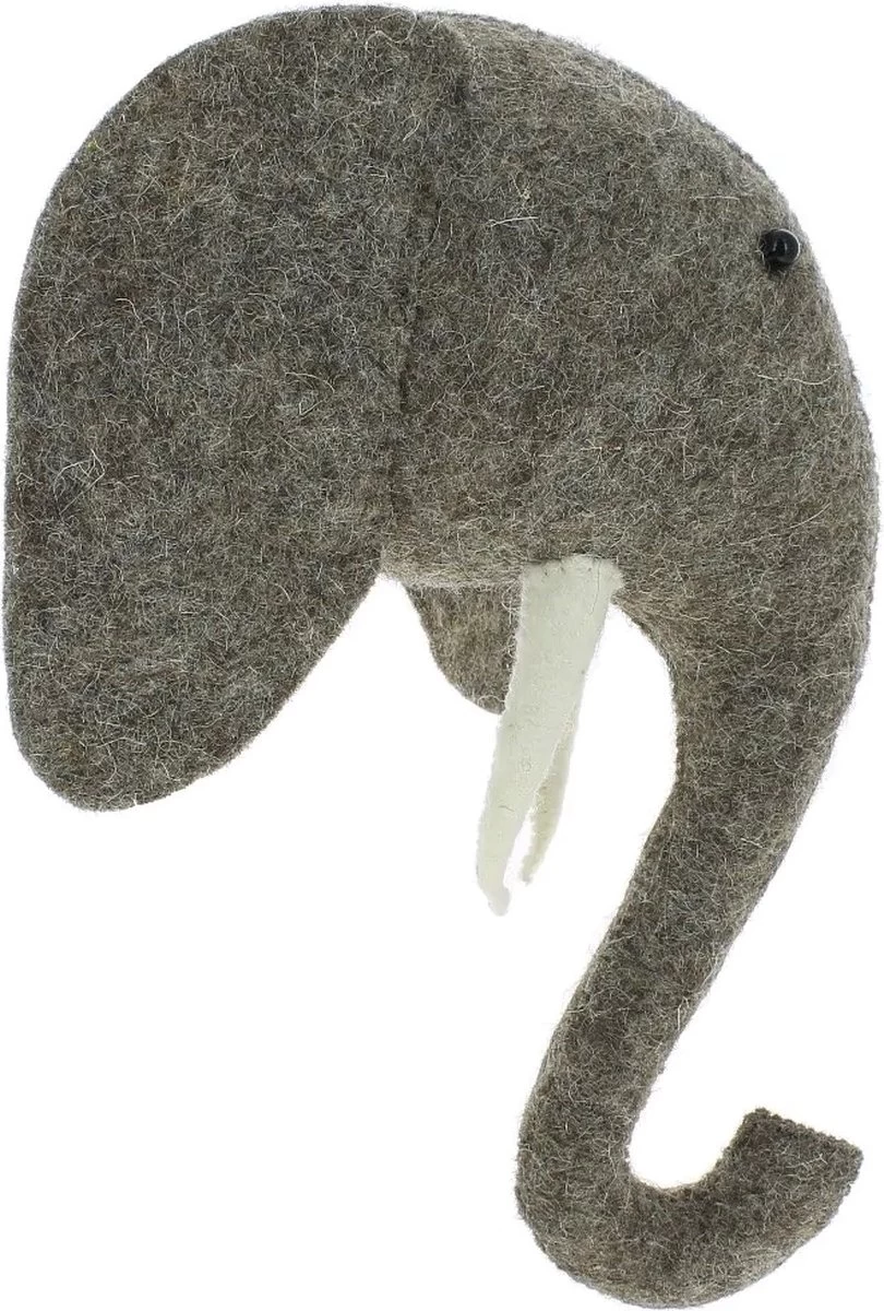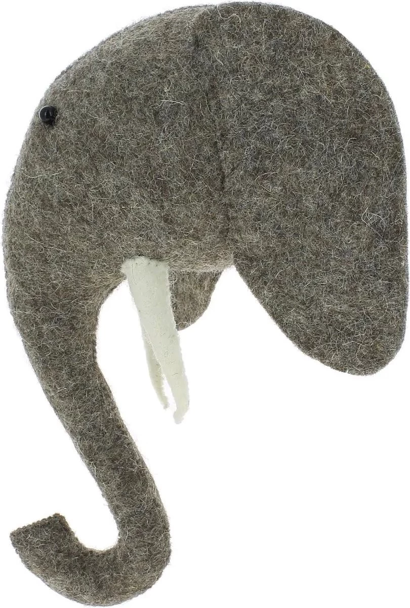 Fiona Walker handgemaakte mini olifantenkop. Elke Fiona Walker dierenkop is handgemaakt waardoor elke dierenkop zijn eigen unieke karakter heeft. Combineer verschillende Fiona Walker dierenkoppen om je eigen wilde muur te creëren. De olifantenkoppen zijn gemaakt van 100% wol met 100% polyester vulling.
