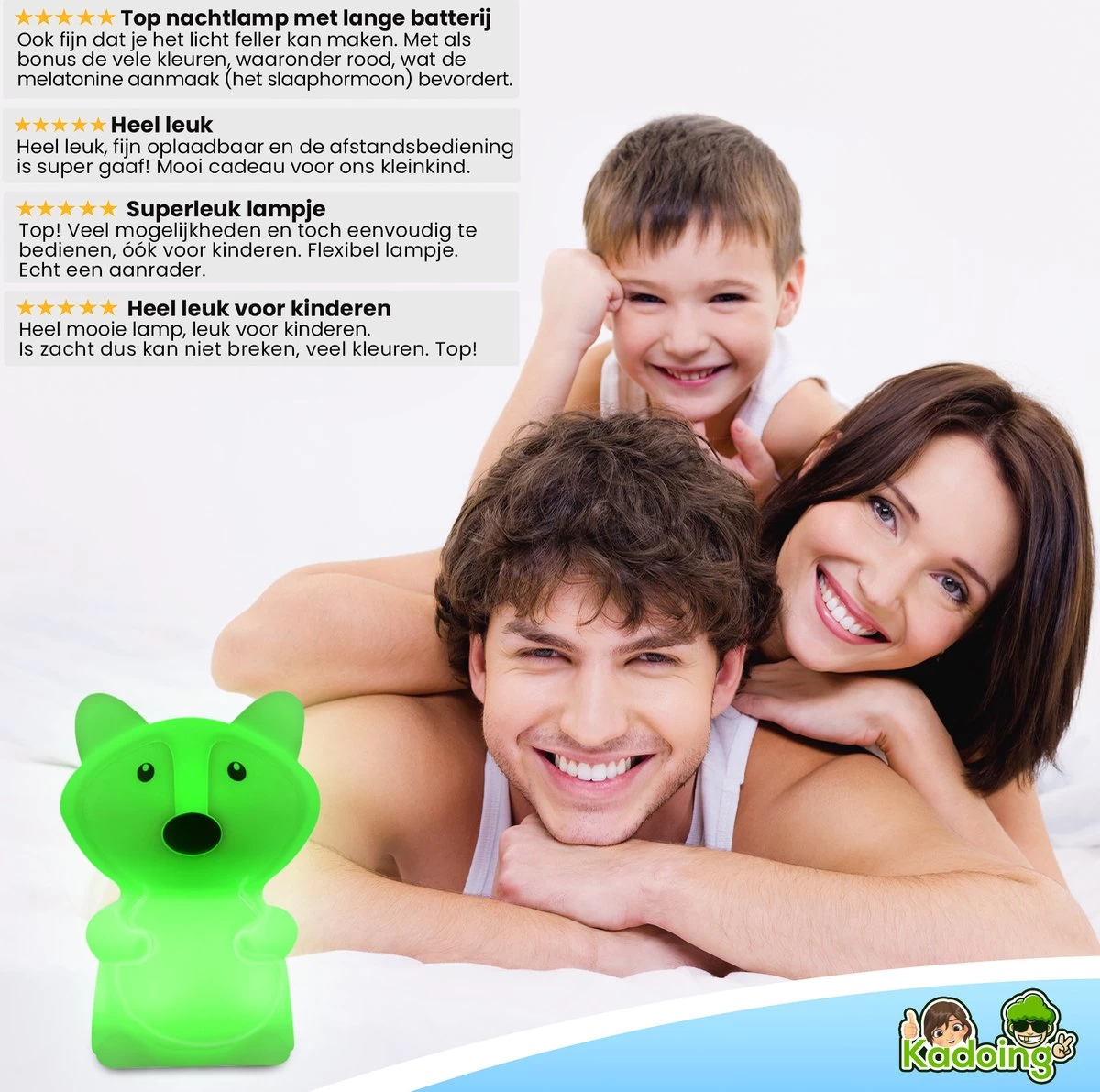 Een goede nachtrust is belangrijk voor een gezonde ontwikkeling bij kinderen. Toch kan alleen slapen in het donker voor onrustige nachten zorgen – zowel voor kind als voor ouder. Daar hebben we bij Kadoing wat op gevonden: maak kennis met de Vos nachtlamp. Het Vos nachtlampje jaagt monsters en spoken weg, is van kindvriendelijk materiaal én is het ideale slaapmaatje voor in bed. Zodat kinderen de rust krijgen die essentieel is voor een gezonde ontwikkeling en zodat ouders ‘s avonds met een gerust hart in bed kunnen stappen.