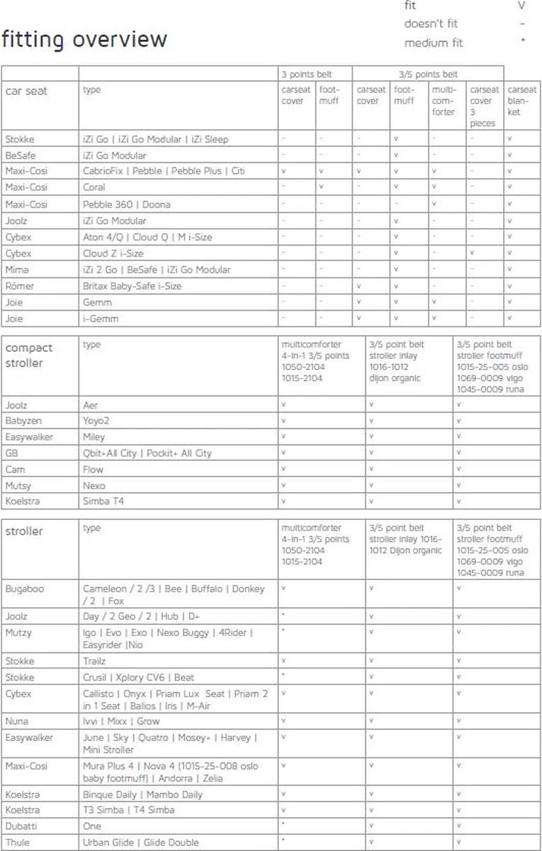 Deze voetenzak is geschikt voor een autostoel 0+ of Maxi-Cosi met een driepuntsgordel. Om te kijken of de voetenzak in jouw autostoel past, heeft Koeka een ‘fitting overview’ samengesteld. Deze keuzehulp vind je tussen de afbeeldingen.