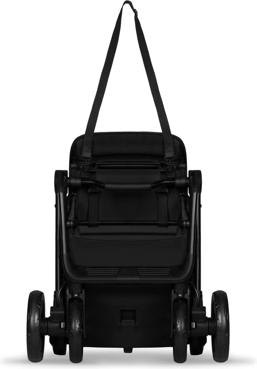 Het duurzame aluminium frame weegt 8,2 kg en is compact op te vouwen. De set bevat een riem en een hoes om de kinderwagen op de schouder te dragen.