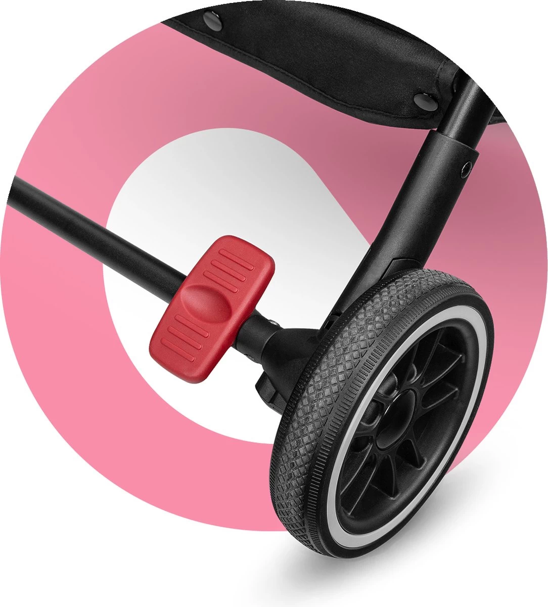 De voorwielen zijn gemakkelijk te manoeuvreren, waardoor de kinderwagen ongelooflijk wendbaar is. De rubber-polyurethaan bekleding garandeert duurzaamheid, rijstabiliteit en slijtvastheid. Schokdempers op alle wielen verminderen de schokken aanzienlijk tijdens het rijden op oneffen oppervlakken, en een comfortabele rem garandeert een uitstekende rijcontrole.