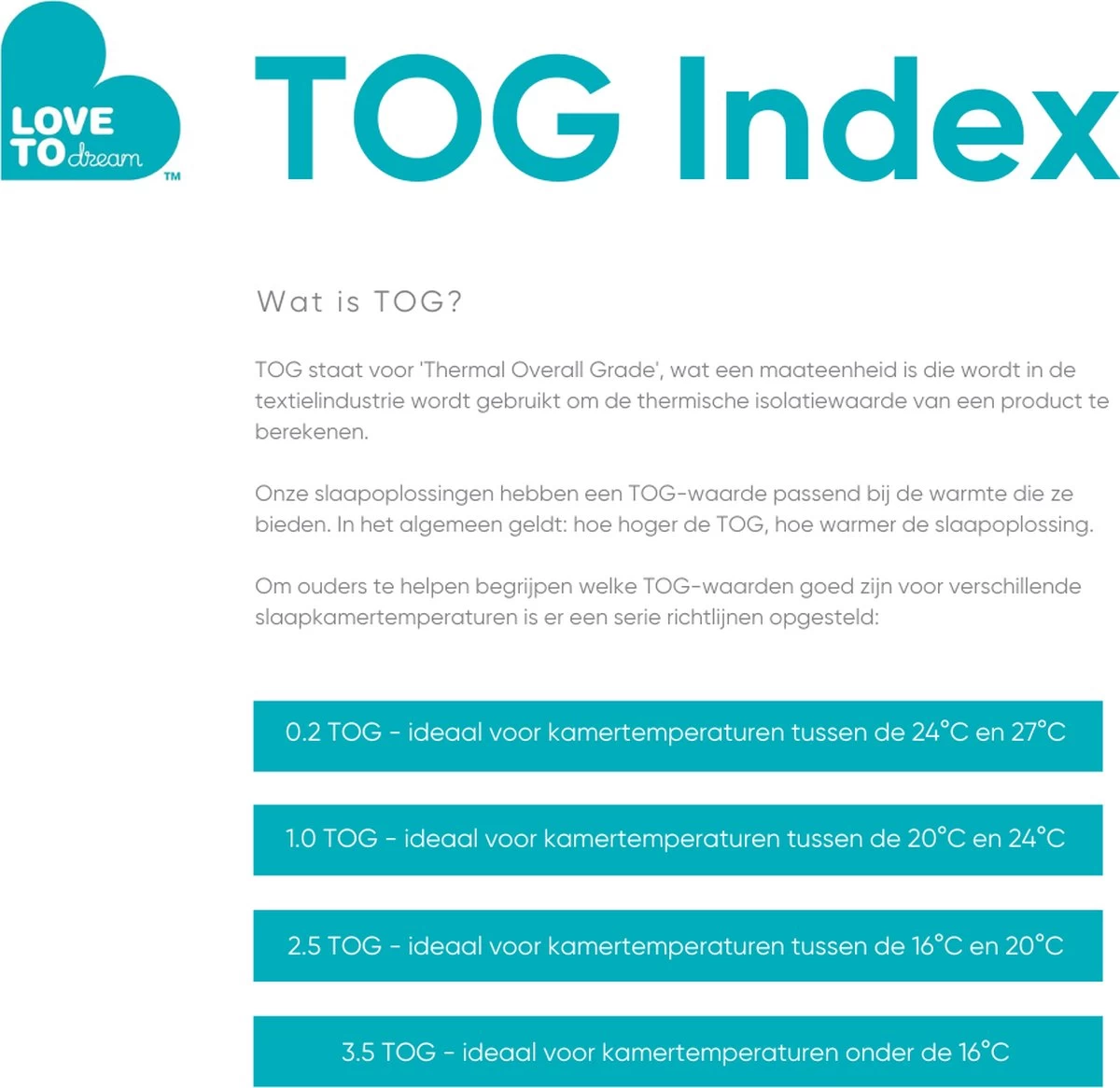 De afkorting TOG staat voor ‘Thermal Overall Grade’; een maateenheid die de thermische isolatie van textiel aan te geven. Een TOG-waarde van 1.0 maakt de De Swaddle Up™ Original geschikt voor een slaapkamertemperatuur tussen de 20°C en 24°C. Gebruik van dekentjes en lakens raden wij hierbij af. Bekijk de TOG-waardetabel voor het kledingadvies onder de De Swaddle Up™ Original.