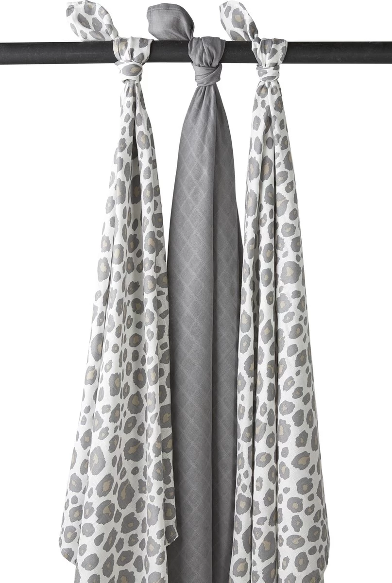 Wat een fijne aanwinst voor je babyuitzet: deze multifunctionele Meyco Baby Hydrofiele Swaddles 3-pack Panter/Uni. De set bestaat uit 3 doeken met daarop een te gekke panterprint.