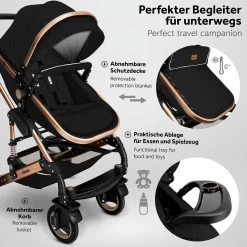 KIDUKU- 3 In 1 Combi-kinderwagen- Zwart/goud- Buggy Incl. Autostoeltje-regenhoes- Inklapbaar