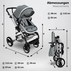 KIDUKU- 3 In 1 Combi-kinderwagen- Grijs/zilver- Buggy Incl. Autostoeltje-regenhoes- Inklapbaar