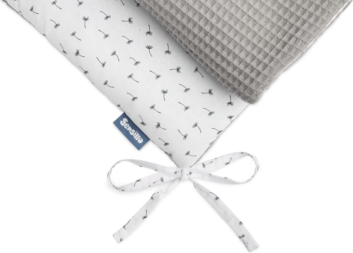 De dunne bedbumper van Sensillo is een alternatief voor de dikke en zware bumpers die veel gebruikt worden in kinderbedden. De dunne anti-allergische eivormige vulling zorgt voor voldoende isolatie, beschermt het kind tegen verwondingen tijdens het bewegen in het bedje en is vooral veilig en minimaliseert het risico op verstikking. De unieke uitstraling van de bumper bestaat uit een combinatie van twee materialen. De ene kant is gemaakt van een zacht en prettig aanvoelend katoen met een wafelstructuur en de andere kant is gemaakt van katoen met een kleurrijke print. Beide stoffen zijn Oeko-Tex gecertificeerd. Om de 30 cm zorgen ingenaaide linten ervoor dat de bumper goed op zijn plaats blijft.